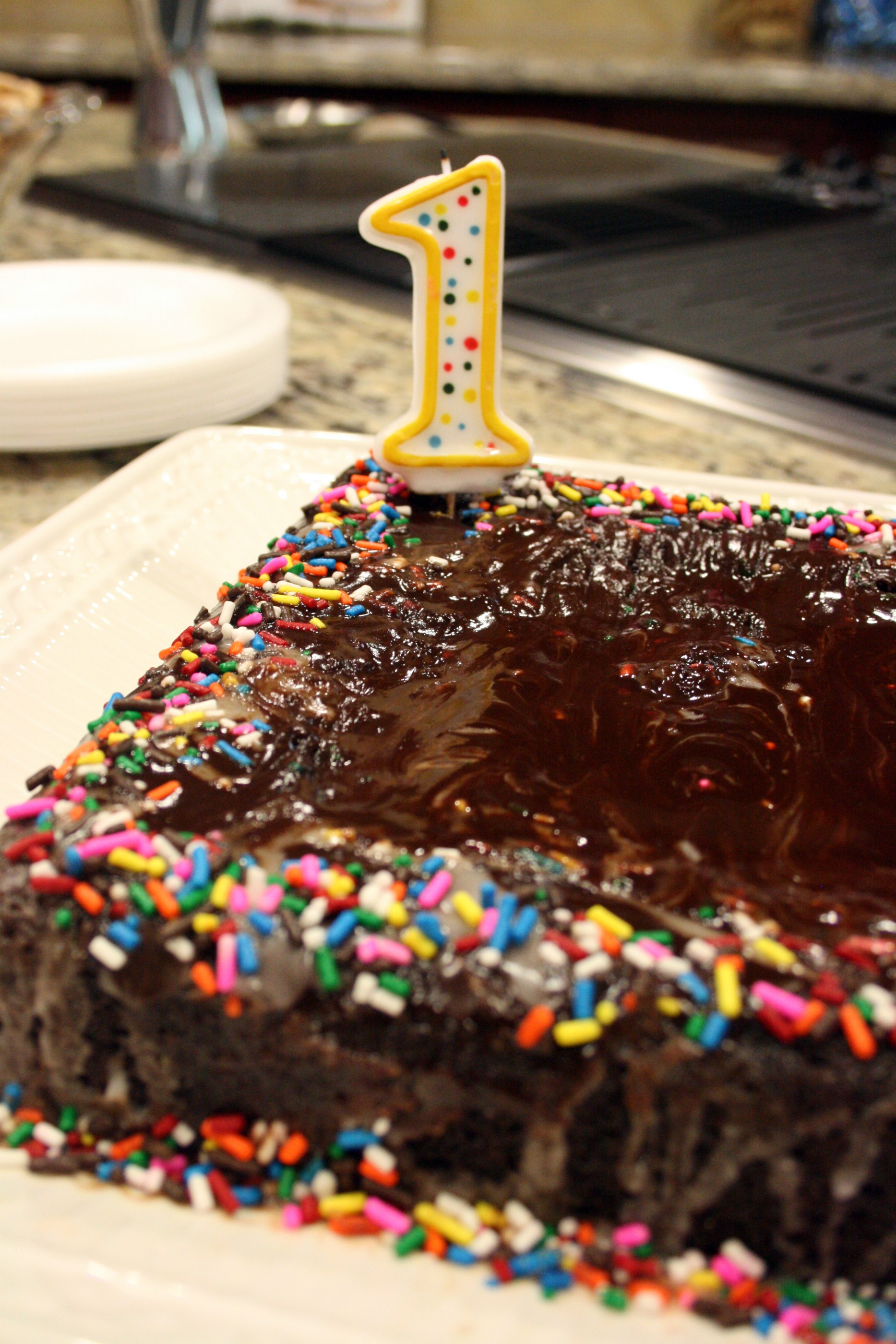 For Little T’s birthday, we used this recipe for a chocolate cake. The recipe is here and it’s from Chef Chloe, the chef who won Cupcake Wars on the Food Network. We didn’t have round cake pans, so we omitted the frosting between the layers and turned it into a sheet cake. The cake was delicious, my mouth is watering just thinking about it. 0_o Little T and I may or may not have cleaned the sides of the pan with our grubby little fingers.