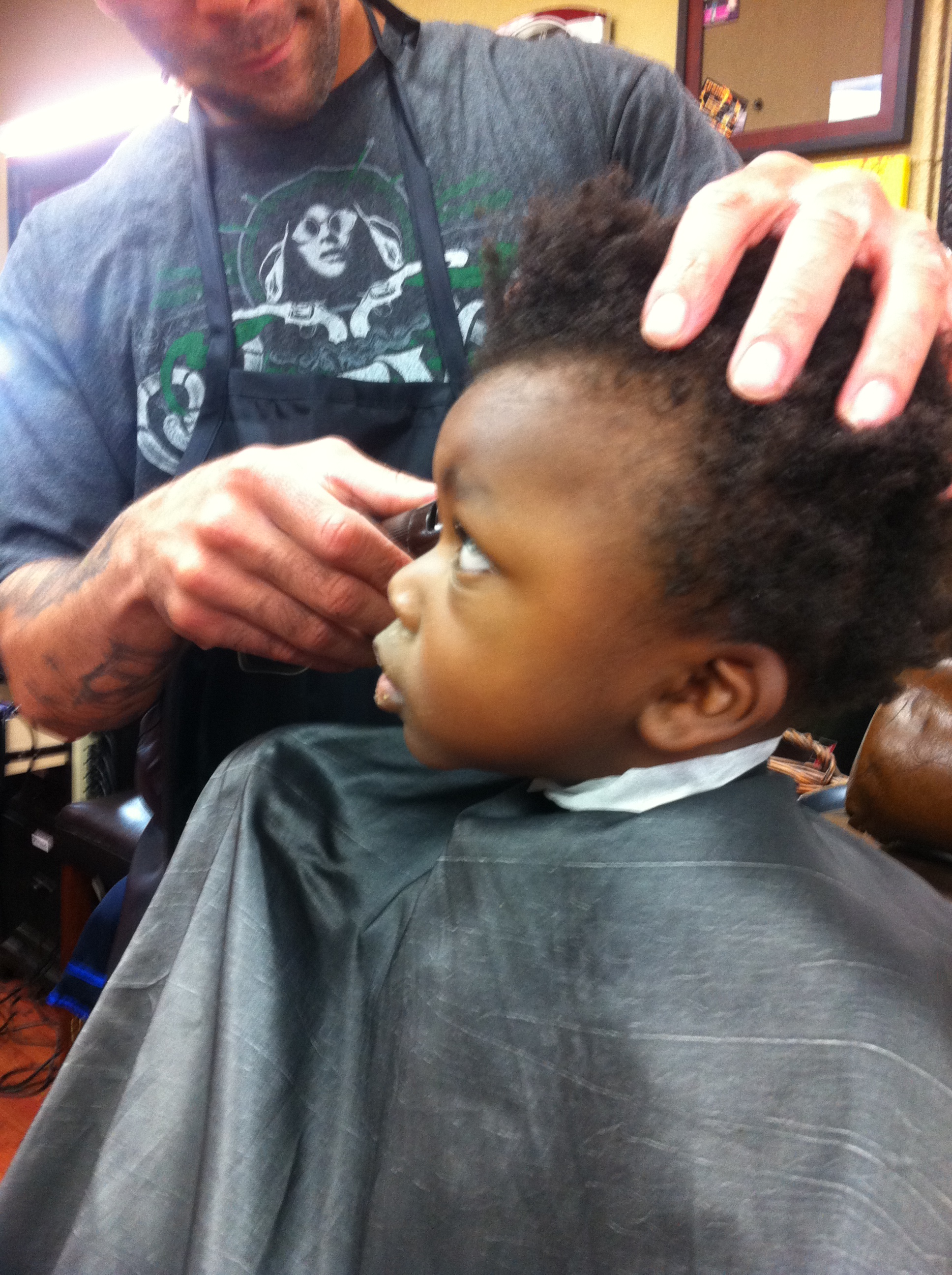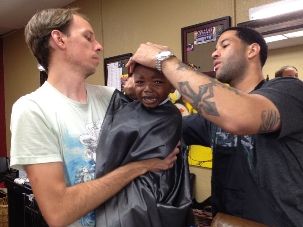 Little T also got his first haircut! We were going to try to keep it long, but we decided to start over from the beginning and shave it all off. We had about 5 guys standing around giving us advice on how to take better care of Little T’s hair. I would have loved to have been a fly on the wall after we left. Heh heh. Little T did well, until he looked at himself in the mirror and saw that half of his hair was gone. Then he lost it and started wailing and crying. He wouldn’t even eat the emergency cookie that we brought with us. When it was done though, he was super happy. His favorite thing to do right now, is go up to people and point to his head and say, “cut!” It must have made a big impression on him.
